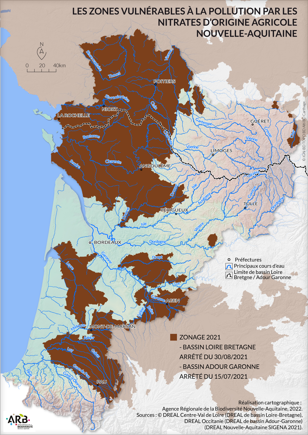En Nouvelle-Aquitaine, près de 36 500 km2 sont classés en zones vulnérables aux nitrates fin 2018, soit environ 43% de la superficie totale régionale (255 990 km² en France en 2012, soit 47% de la superficie du territoire métropolitain). Le Nord de la région, principalement Poitou-Charentes, est particulièrement concerné. La partie Sud, située sur le bassin Adour-Garonne, l’est également, mais de manière plus éparse. À noter que l’Est de la région n’a que très peu de zones vulnérables. Les perturbations rencontrées sur ce territoire sont plutôt liées à la présence de nombreux barrages et étangs (induisant des modifications hydrologiques ou morphologiques pouvant altérer la qualité des milieux aquatiques), à l’eutrophisation des plans d’eau, à des pollutions industrielles ponctuelles…