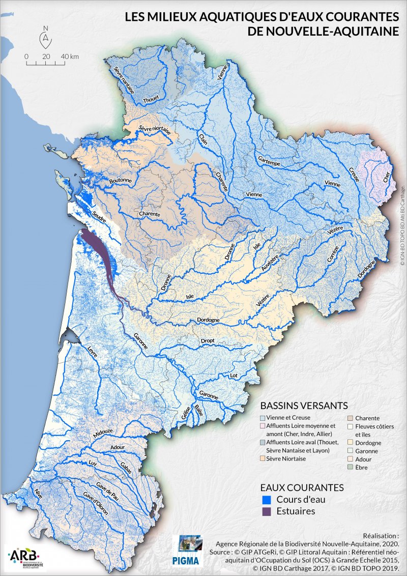 Un réseau hydrographique réparti sur deux bassins versants: Adour-Garonne (71% du territoire régional) et Loire-Bretagne (29% du territoire régional)