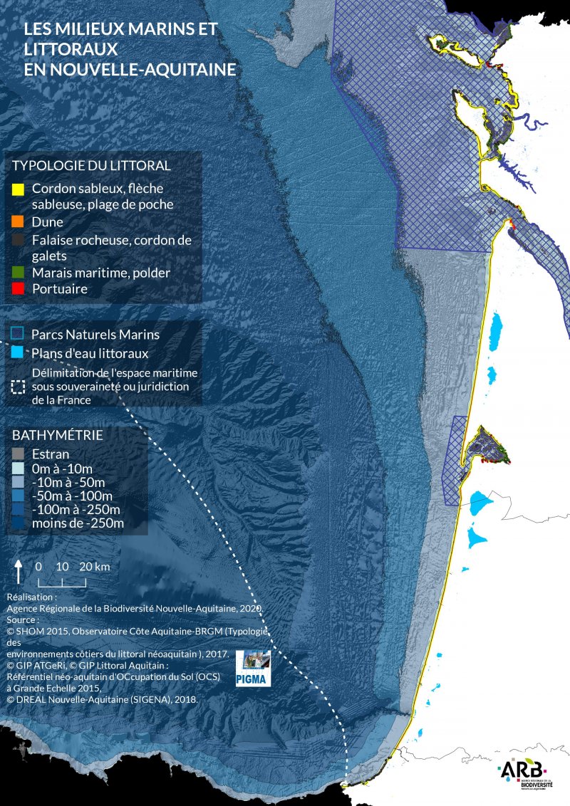 En Nouvelle-Aquitaine, le plateau continental décroît du nord au sud, passant de 180 km au niveau des Pertuis charentais à 55 km au niveau des Landes, pour atteindre seulement 2 km au niveau du gouf de Capbreton (OCA, 2017). Les goufs du Cap Ferret et de Capbreton sont des vallées sous-marines qui creusent le plateau continental. Le gouf de Capbreton, long de 270 km, rejoint la plaine abyssale vers -4 500 mètres de profondeur.