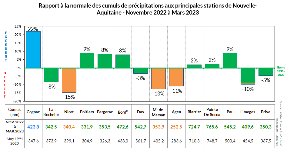 Grâce aux pluies abondantes et salvatrices enregistrées au mois de mars, supérieures aux normales (+de 50 à +100 %) sur une large majorité du territoire excepté sur les Landes et les Pyrénées-Atlantiques (déficits atteignant jusqu’à -25 %), la pluviométrie cumulée sur la période de novembre 2022 à mars 2023 est proche de la normale sur une bonne partie du territoire de Nouvelle- Aquitaine, hormis au sud et à l’est de la région, où elle est déficitaire (déficit de -10 à -15%).