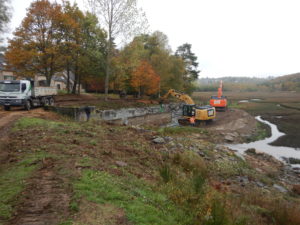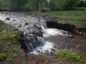 La présence de la digue, au niveau du plan d’eau, a entraîné une accumulation de sédiments fins (vase) plus en amont. Après sa destruction, nous imaginions que la Vienne reprendrait son profil initial. Les sédiments, accumulés dans l’ancien lit, se sont décrochés et ont glissé : l’érosion régressive s’est mise en place, en remontant vers l’amont depuis l’ancien emplacement de la digue. Nous avons tout de même observé des phénomènes surprenants, en amont du site. La vidange du plan d’eau avait pour objectif de garder le site à sec le plus longtemps possible pour que les sédiments sèchent et puissent rester un maximum sur place. La Vienne a retracé son lit, exploitant un parcours emprunté par la rivière avant la construction de la digue mais en créant aussi de nouvelles sinuosités dans la tourbe nous montrant que le matelas alluvial (galets, sable d’origine) était présent sur l’ensemble de la surface de la tourbière initiale, ce qui signifie que la Vienne a énormément bougé au cours du temps dans ce secteur. La tourbière plus ou moins profonde (jusqu’à 6 mètres en amont du plan d’eau), a généré sur le parcours de la Vienne en certains endroits des cascades liées à un point dur (les débris organiques de la tourbe se délitent parfois très difficilement). Les cascades vont disparaître avec le temps mais nous avons décidé d’en éroder une mécaniquement en décapant le substrat pour faire une pente acceptable tout en permettant la reprise du phénomène d’érosion régressive. Ceci n’a pas d’effet en aval, où tous les sédiments ont été gérés dans deux bassins de décantation.