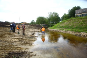 Il y a eu également de l’érosion progressive, vers l’aval. Le profil longitudinal du cours d’eau allait partiellement se modifier, sans que nous sachions comment se comporterait la rivière. En effet, la zone tourbeuse en amont de la digue était très plate et nous ne connaissions pas les impacts sur l’aval. Nous avons créé un seuil de fond, entre la digue et le pont de pierres, pour éviter que l’érosion progressive ne creuse le lit à un niveau qui aurait déstabilisé les assises du pont. Plus en aval, la morphologie globale est en mouvement mais sans phénomène critique et l’ensemble s’équilibrera au grès des crues.
