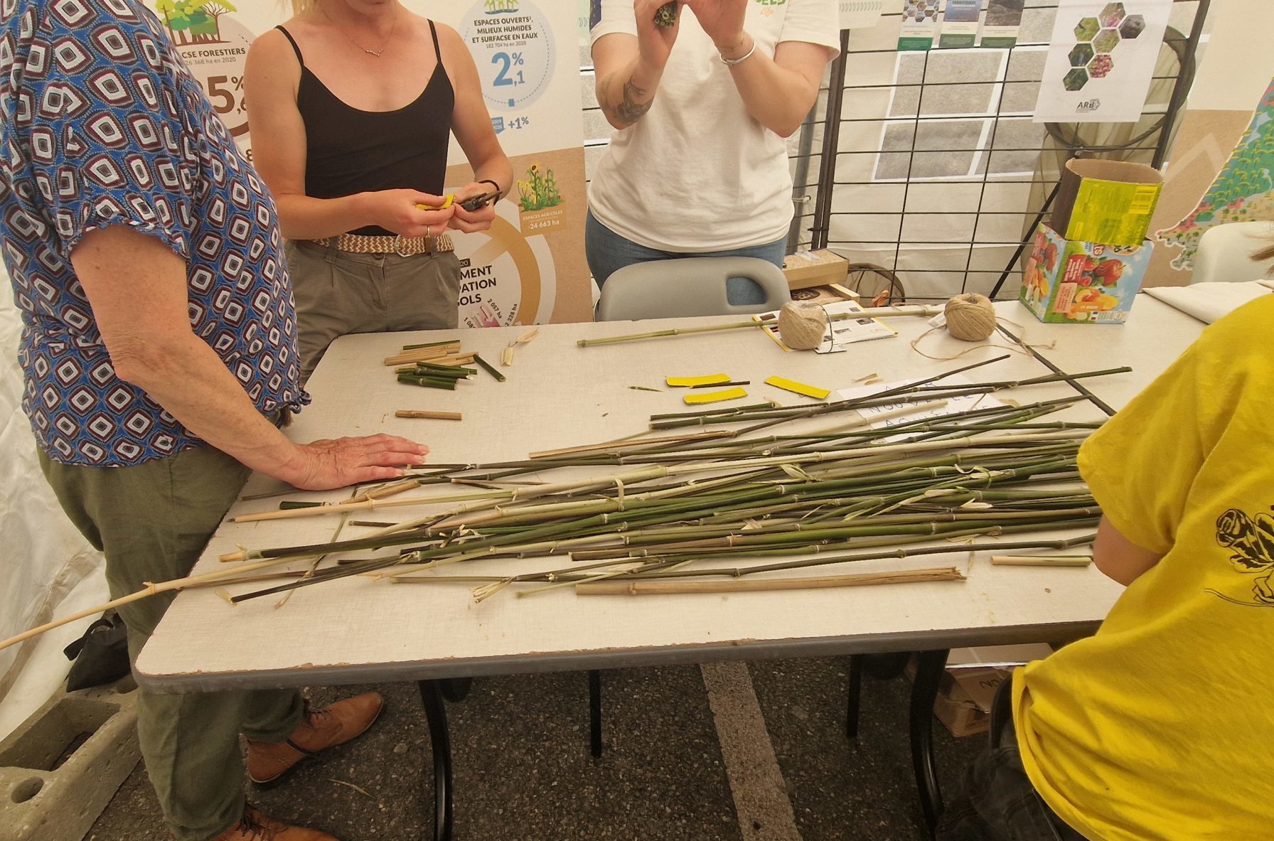 Ensuite, le groupe a poursuivi le rendez-vous avec la création de mini hôtels à insectes pour accueillir les abeilles sauvages dans leurs jardins. Lors de l’animation, les fagots ont été réalisés avec des tiges de bambous (entre 8 et 12mm de creux). Ils permettront aux abeilles sauvages caulicoles d’y déposer leurs larves.