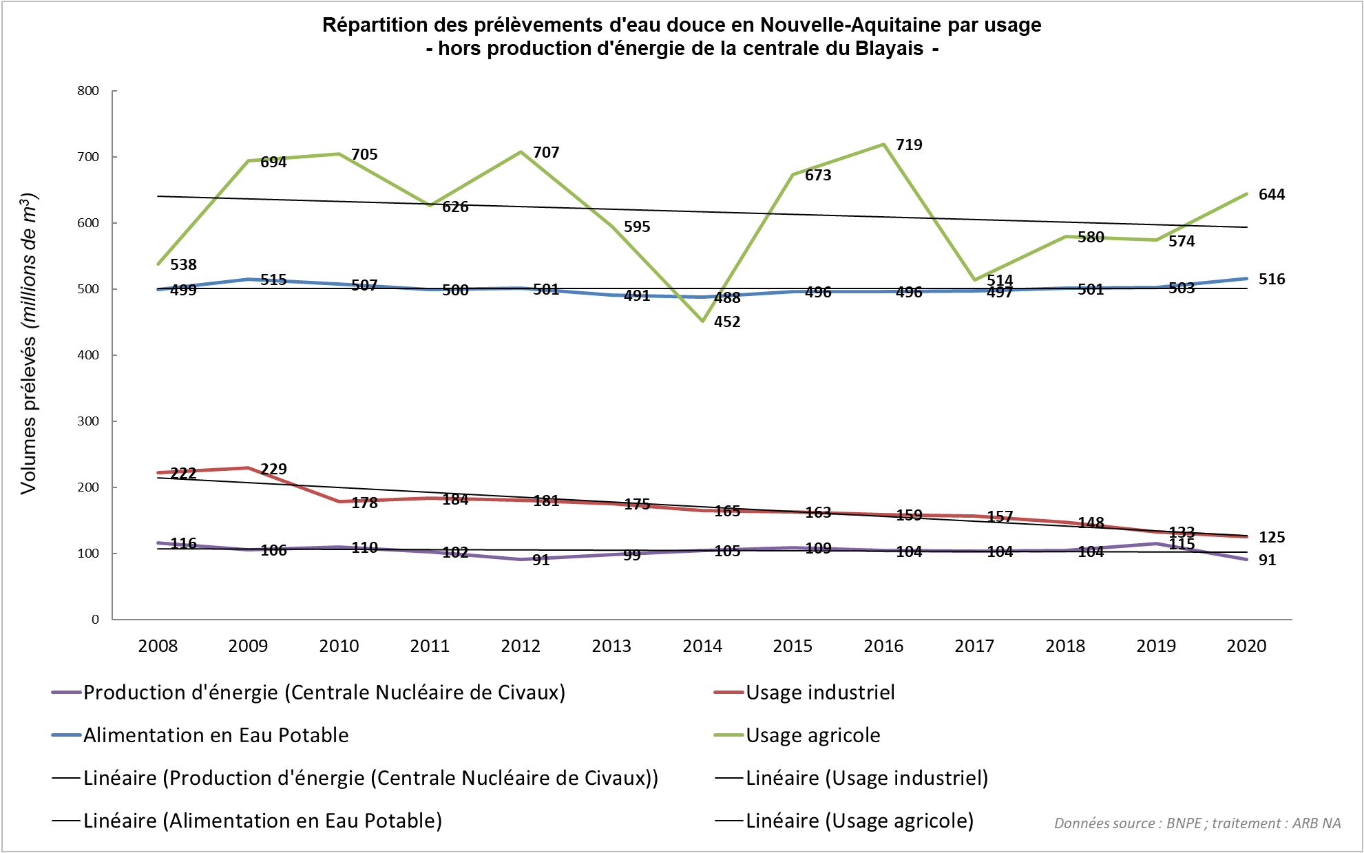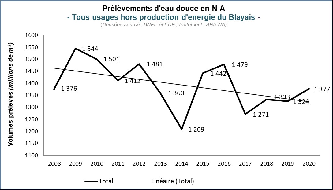 La tendance générale depuis 2008 est globalement à la baisse notamment du fait de la diminution continue des prélèvements industriels (environ -7,25 Mm3 par année ; de 222 Mm3 en 2008 à 125 Mm3 en 2020). Concernant les autres usages, les tendances à la baisse sont plus « approximatives » et semblent moins marquées.  À noter que les prélèvements agricoles sont très dépendants des situations pluviométriques, ainsi que des assolements et de l’influence des cours des produits agricoles.