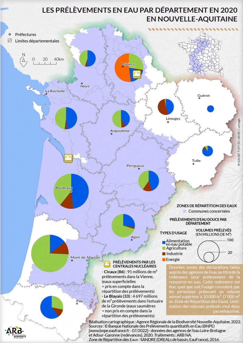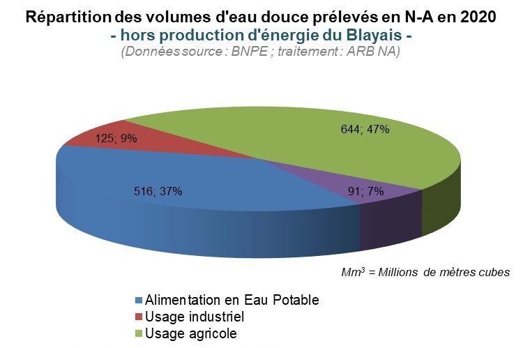 Les prélèvements totaux de 2020 en Nouvelle-Aquitaine s’élèvent à environ 1,377 Milliards de m3 ce qui reste assez proche des 4 dernières années (2017 à 2020) avec toutefois une légère hausse.