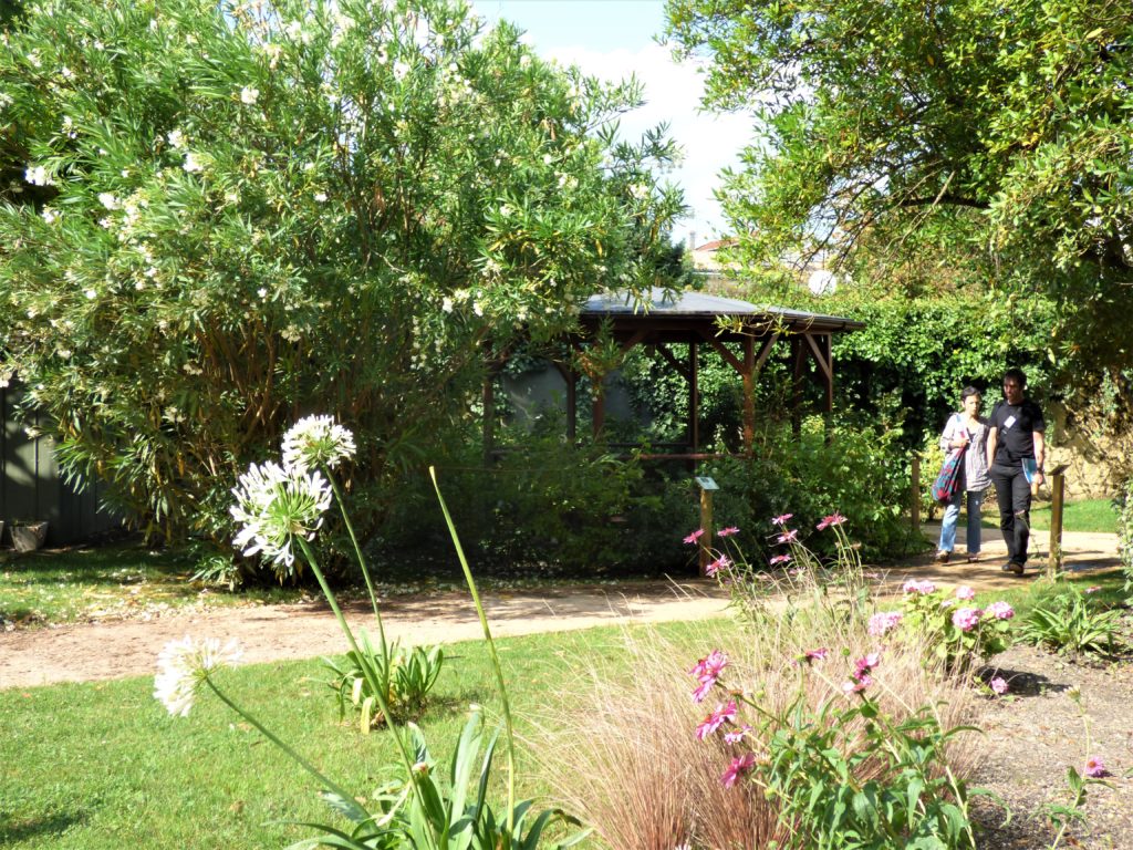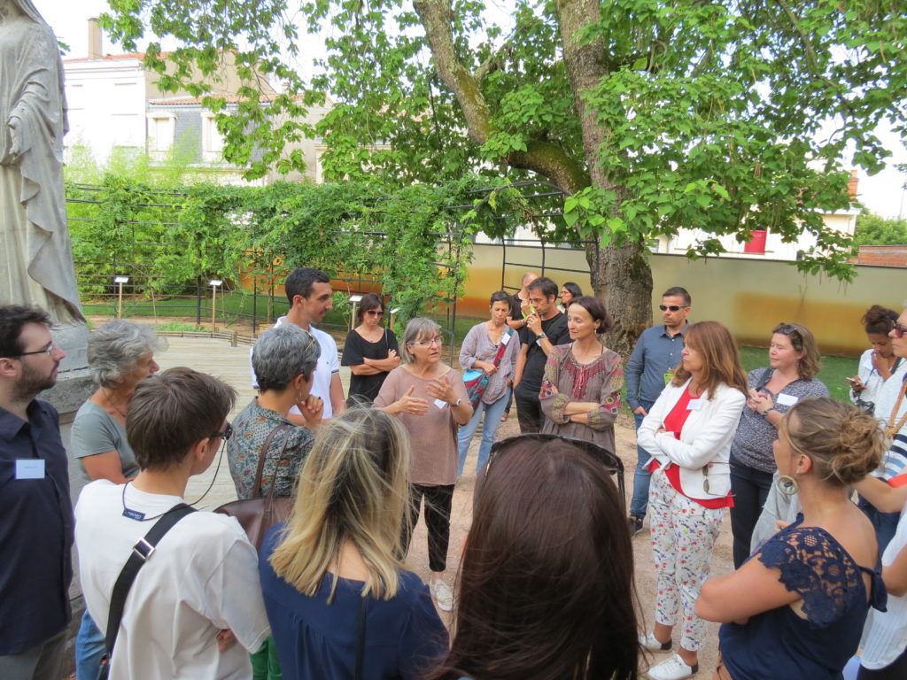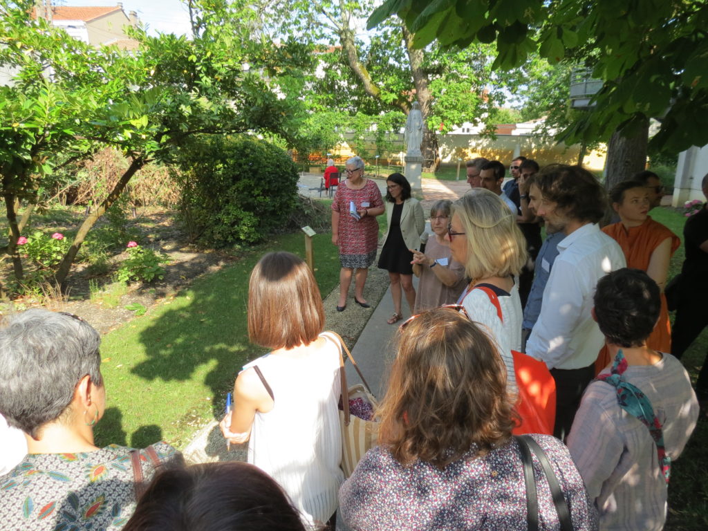 Les premiers échanges ont débuté lors de la découverte du Jardin des Sens, espace de nature urbaine dont la vocation thérapeutique permet aujourd’hui d’accompagner la démarche de soins, le bien-être des patients, de leurs proches et des professionnels. A l’origine du projet : 3 soignantes de l’établissement (dont Brigitte Janjaud, qui commentait la visite) qui ont souhaité donner un sens nouveau au patrimoine historique du parc, en réhabilitant le jardin comme un parcours initiatique apaisant et soignant. Il s’agit d’un travail d’équipe interdisciplinaire, entre les professionnels de Marie Galène et les élèves du BTS du CDFA du Lycée agricole de Blanquefort, pour dessiner les aménagements paysagers en tenant compte des orientations médicales et des enjeux de préservation-valorisation de la biodiversité (choix d’essences végétales locales et non allergisantes, plantation d’espèces médicinales, panneaux pédagogiques pour prendre connaissance des oiseaux présents au jardin et utiliser l’écoute de leurs chants comme un stimuli sensoriel, etc.). « Le Jardin des Sens est une des illustrations de la démarche de développement durable portée par l’établissement », explique Rémy Bironneau, adjoint à la Direction de la Maison de Santé.