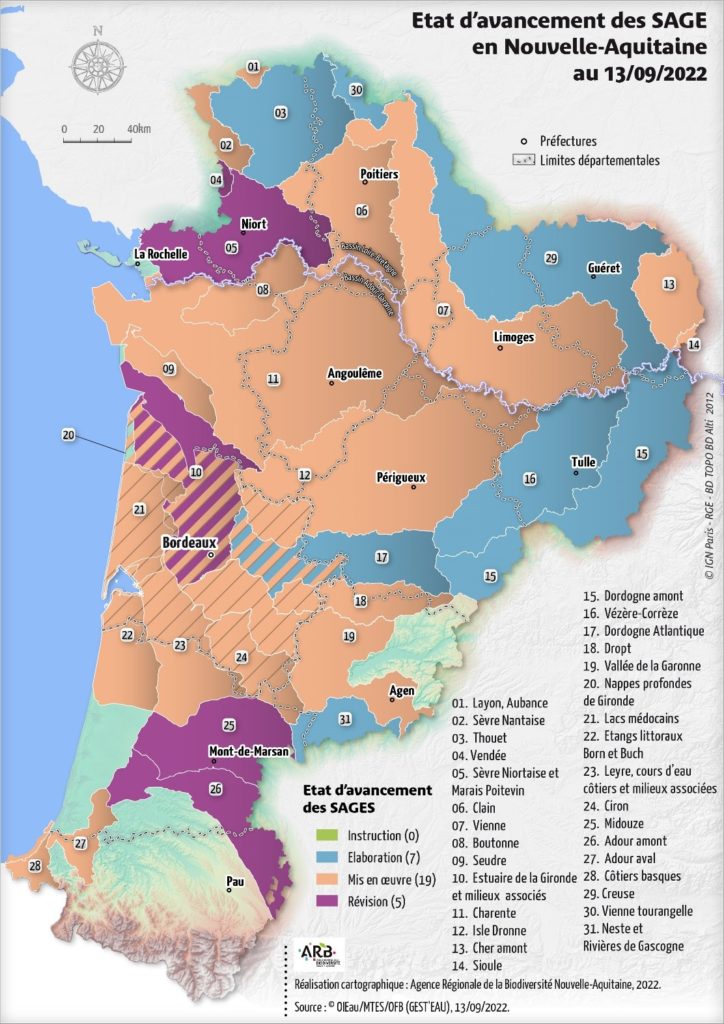 À l’échelle néo-aquitaine, il existe une trentaine de SAGE, couvrant plus de 87% du territoire. Plus des 2/3 des SAGE sont en phase de mise en œuvre ou en révision.
