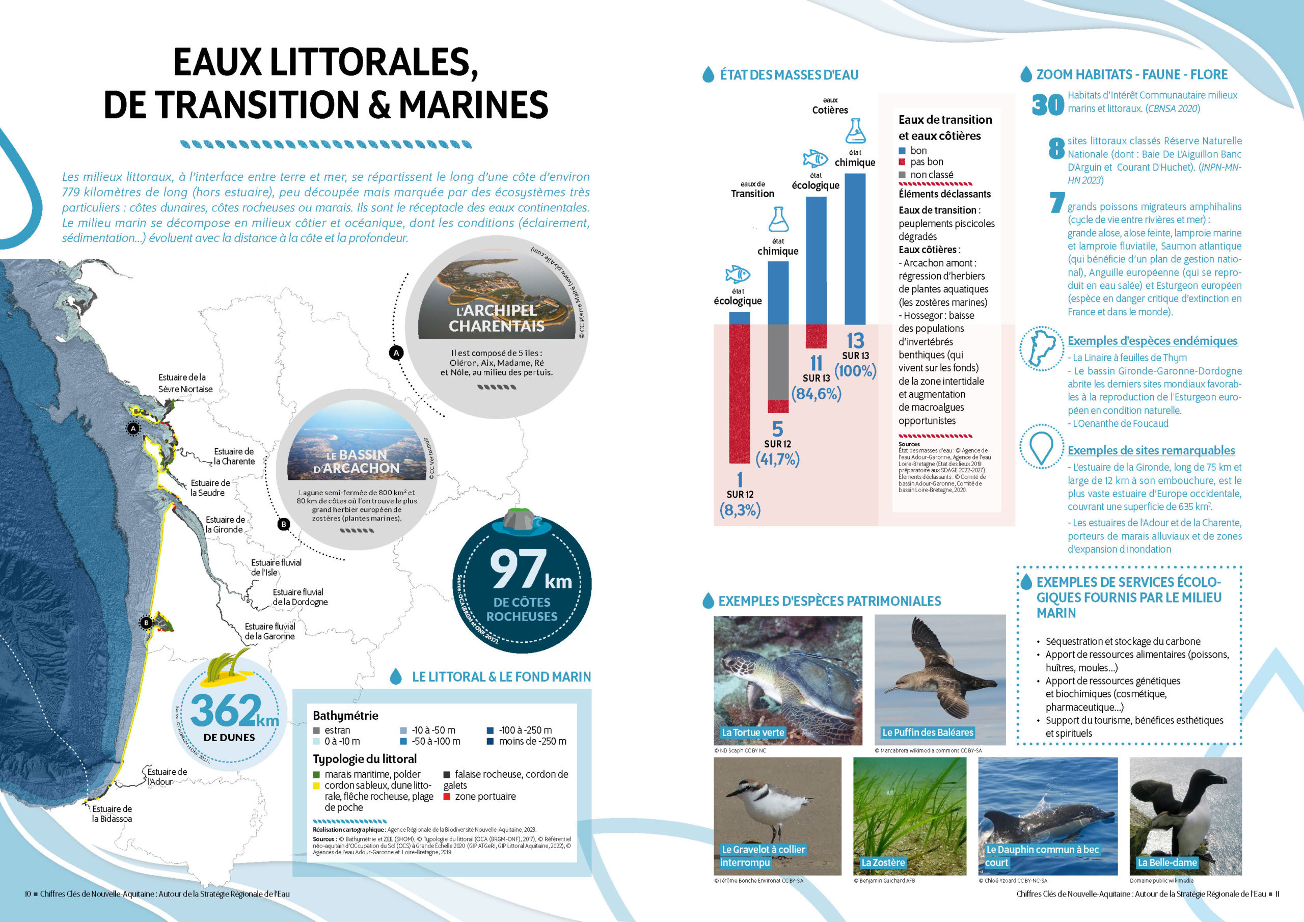 Cette publication a pour ambition de donner une vision de l’eau en Nouvelle-Aquitaine, tant dans sa dimension écosystème que ressource, à travers chiffres clés, photos, cartes et illustrations.