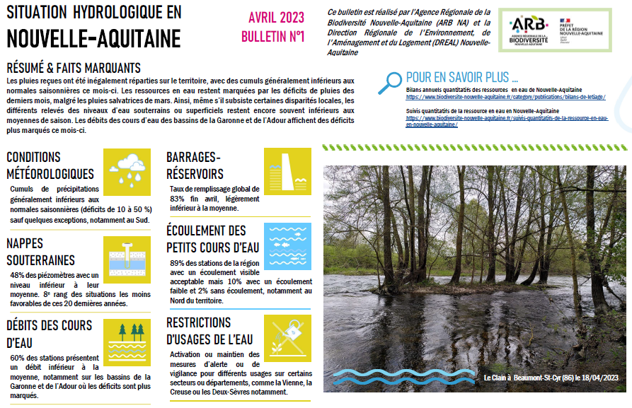 Nous avons le plaisir de vous annoncer la publication de la 1re édition du bulletin mensuel de Situation Hydrologique en Nouvelle-Aquitaine (avril 2023). Il est réalisé par l’Agence Régionale de la Biodiversité Nouvelle-Aquitaine (ARB NA) et la Direction Régionale de l’Environnement, de l’Aménagement et du Logement (DREAL) Nouvelle-Aquitaine.