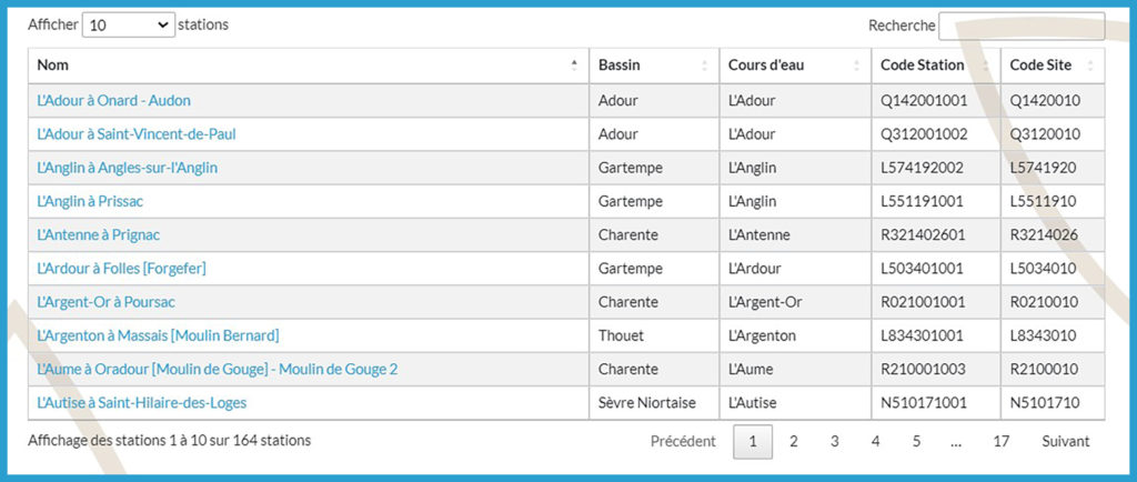 • Le tableau : des petites flèches sont présentes à côté des titres des colonnes afin de modifier le tri par défaut qui se fait avec le nom de la station. Il est également possible d’afficher plus de 10 stations dans le tableau et d’accéder aux autres stations grâce à la numérotation située sous le tableau.